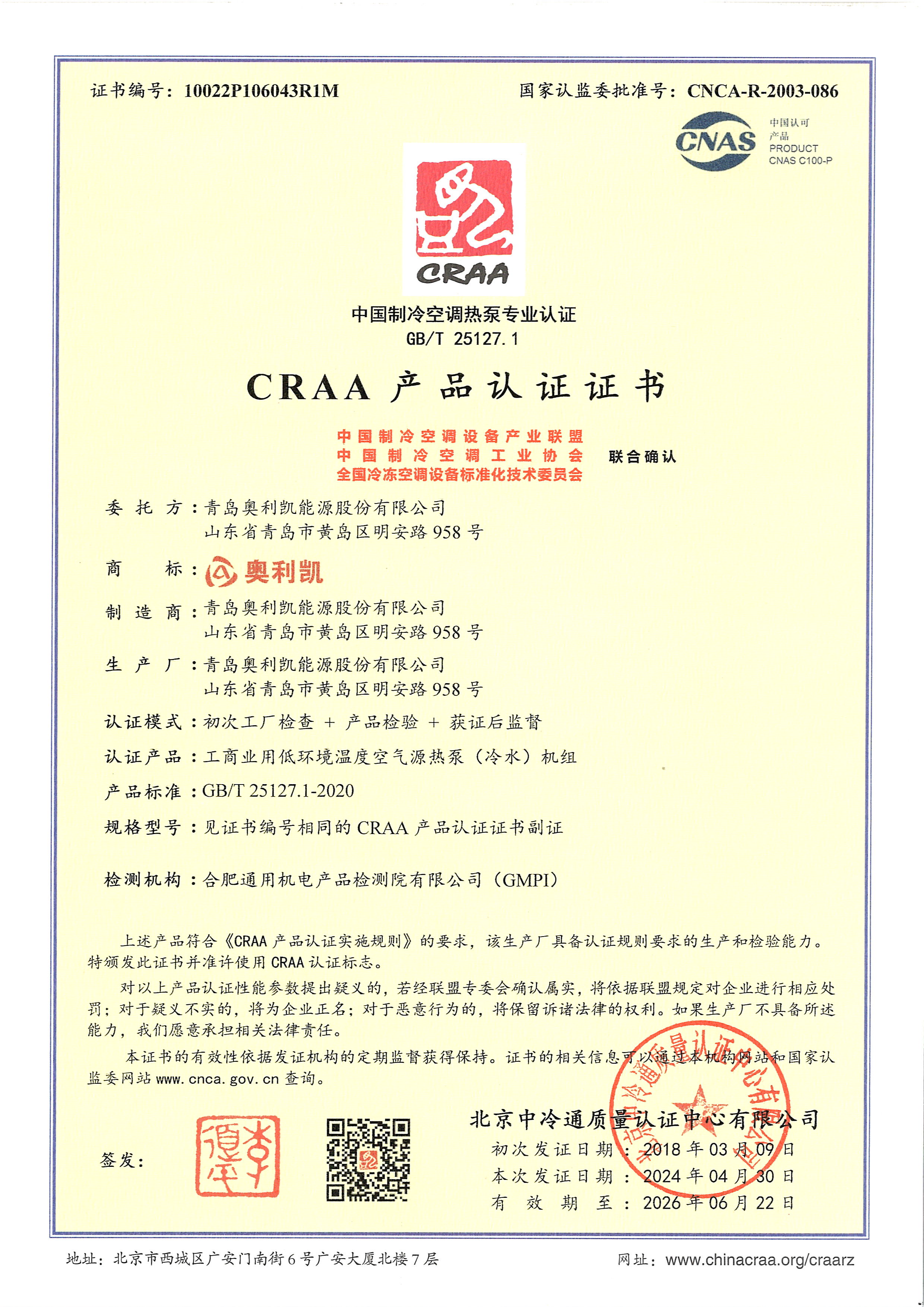 CRAA產(chǎn)品認(rèn)證證書